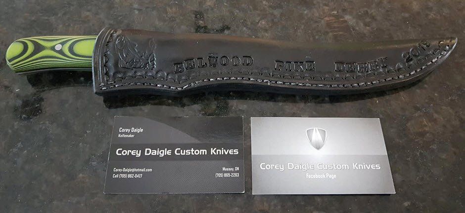 This is a handmade one of a kind fillet knife crafted and designed by blade smith Cory Daigle. Fully custom shieth for the Belwood Pike Derby