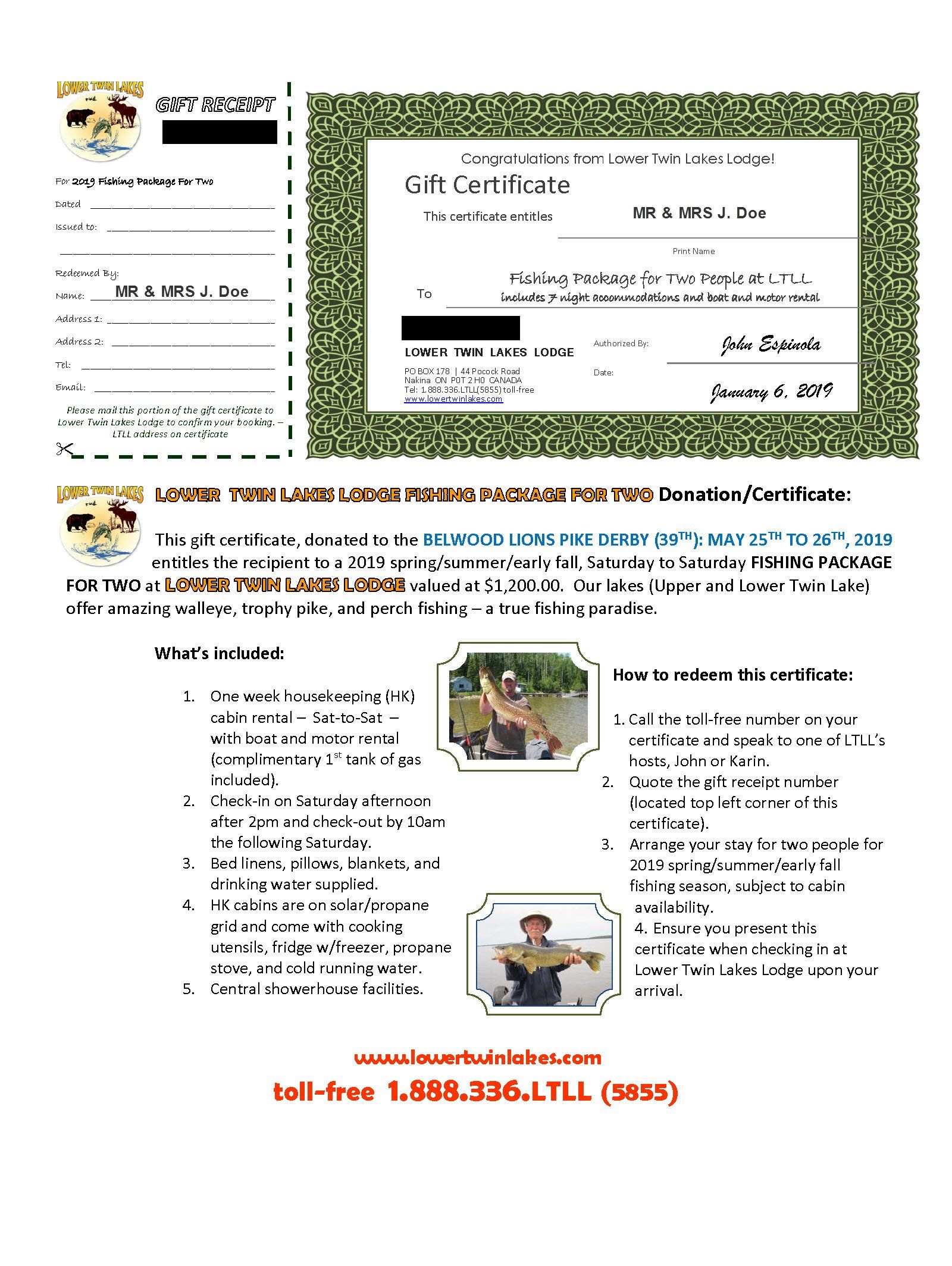 FIRST PRIZE - Donated by Lower Twin Lakes Lodge, Nakina